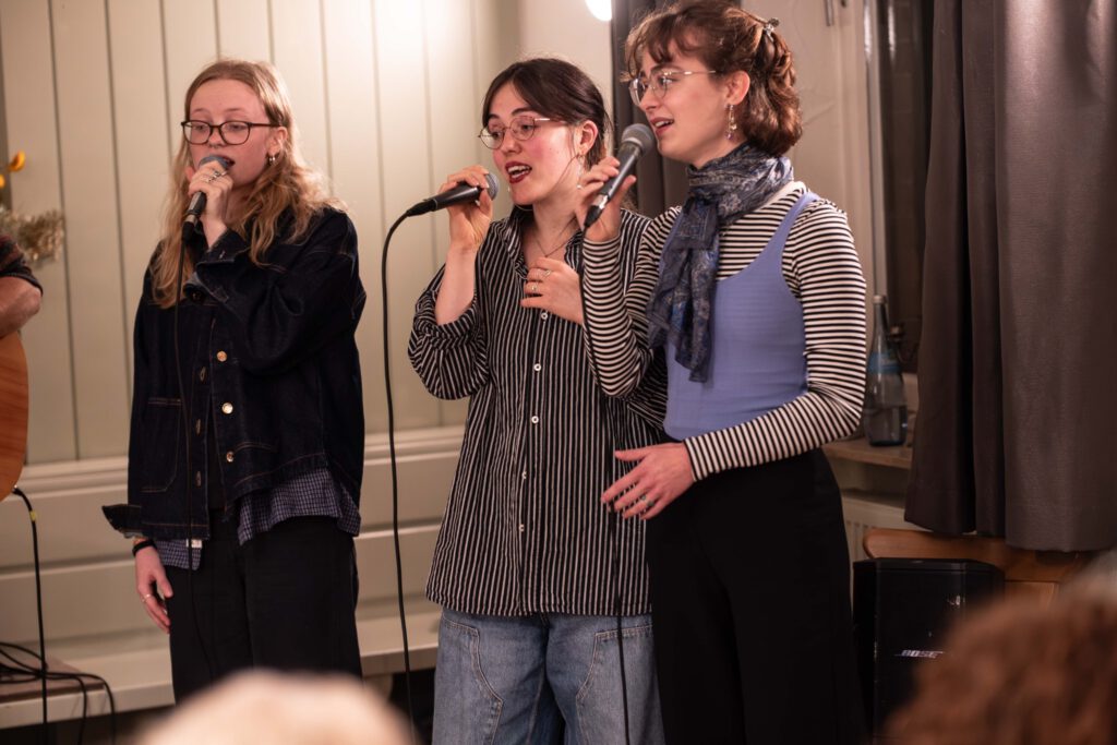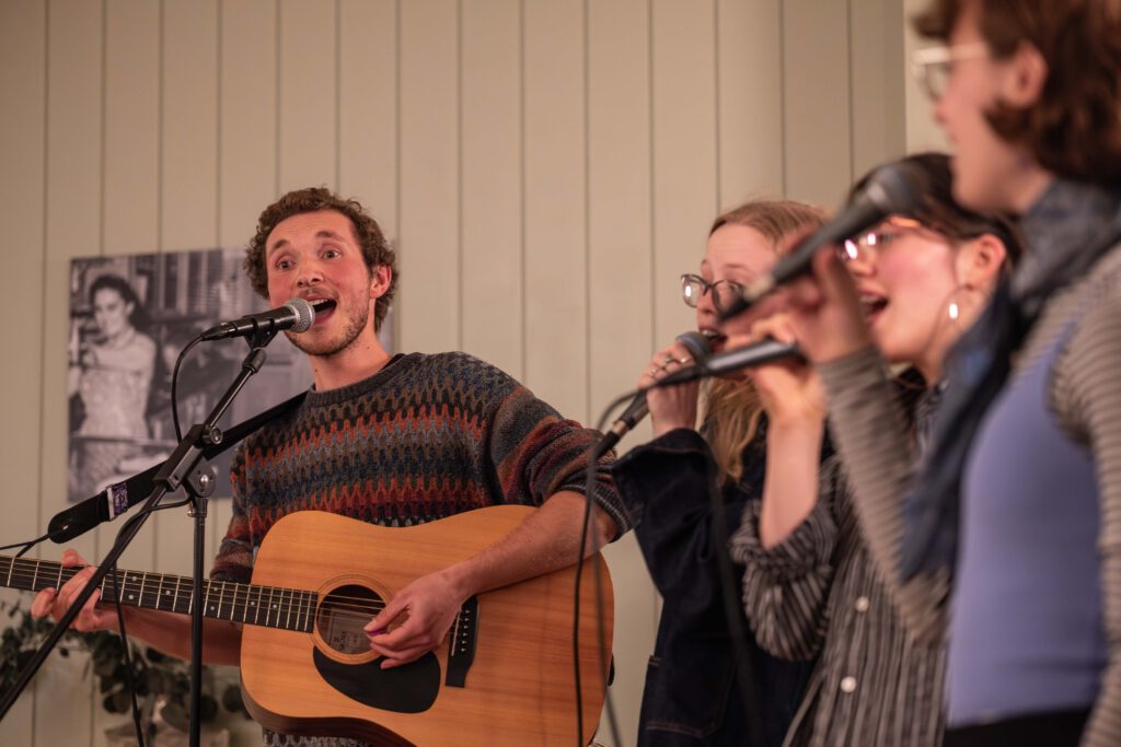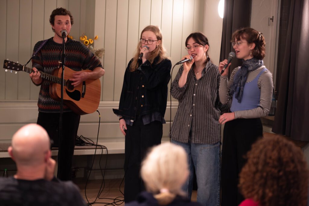 Die zweite Hälfte des Konzerts bestritt Vincent Water dann nicht mehr allein. Vielmehr ließ er sich von Milena, Lilly und Lola, drei Sängerinnen, die er von der Musikhochschule Mannheim kennt, in unterschiedlicher Zusammensetzung begleiten. Dieser Teil des Abends überzeugte durch stimmliche Varianz und einen unverwechselbaren A-Capella-Charme.
