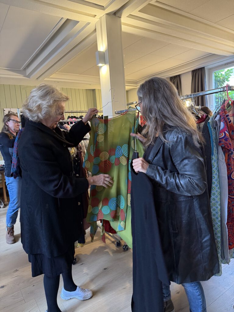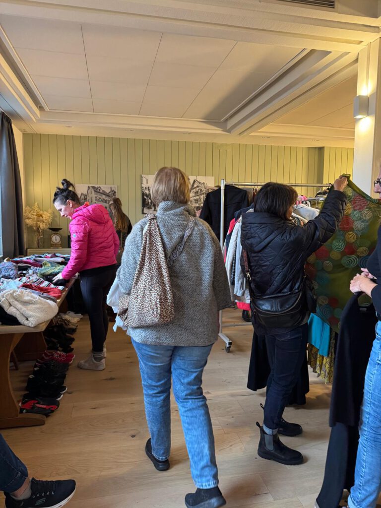 Von 14:00 bis 17:00 Uhr konnte Frau im Schwanensaal nach Lust und Laune in einem überraschend großen Angebot stöbern und in der zum Umkleideraum umfunktionierten Gaststube alles anprobieren, was sie von den übervollen Kleiderständern oder vollbelegten Tischen so anlachte. Zahlreiche Kleider, Blusen, Röcke und Jacken wechselten im Verlauf des Nachmittags flugs ihre Besitzer und manch eine der zahlreichen Besucherinnen ging beseelt und mit vollen Taschen wieder nach Hause – jedoch nicht, ohne zuvor noch in gemütlicher Atmosphäre bei Kaffee und Kuchen bzw. einem Glas Sekt die neuen Errungenschaften für den eigenen Kleiderschrank mit den anderen anwesenden Frauen zu feiern.