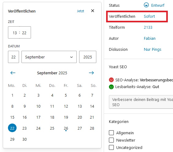 Klicke dazu in der rechten Seitenleiste unter „Veröffentlichen“ auf „sofort“.